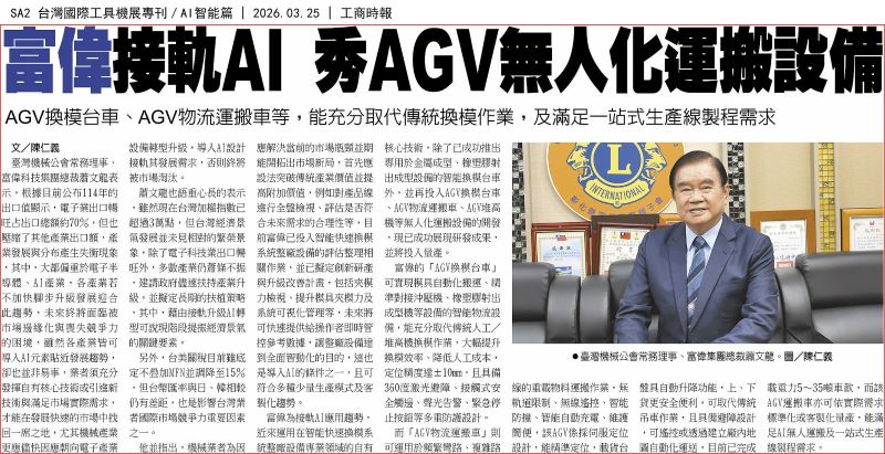 富偉為接軌AI應用趨勢,近來運用在智能快速換模系統整廠設備專業領域的自有核心技術,除了已成功推出專用於金屬成型、橡塑膠射出成型設備的智能換模台車外,並再投入AGV換模台車、AGV物流運搬車、AGV堆高機等無人化運搬設備的開發,現已成功展現研發成果,並將投入量產。
