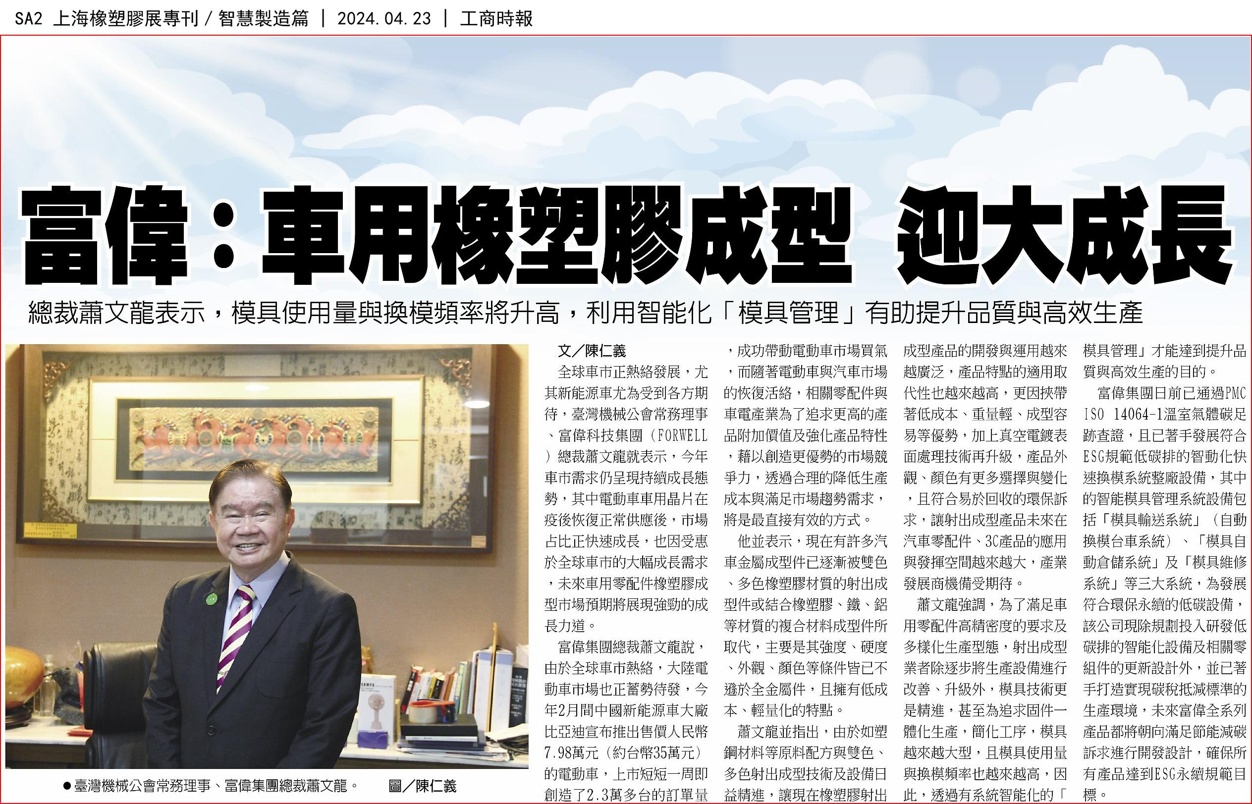 全球車市正熱絡發展,尤其新能源車尤為受到各方期待,臺灣機械公會常務理事、富偉科技集團(FORWELL)總裁蕭文龍就表示,今年車市需求仍呈現持續成長態勢,其中,電動車車用晶片在疫後恢復正常供應後,市場占比正快速成長,也因受惠於全球車市的大幅成長需求,未來車用零配件橡塑膠成型市場預期將展現強勁的成長力道。